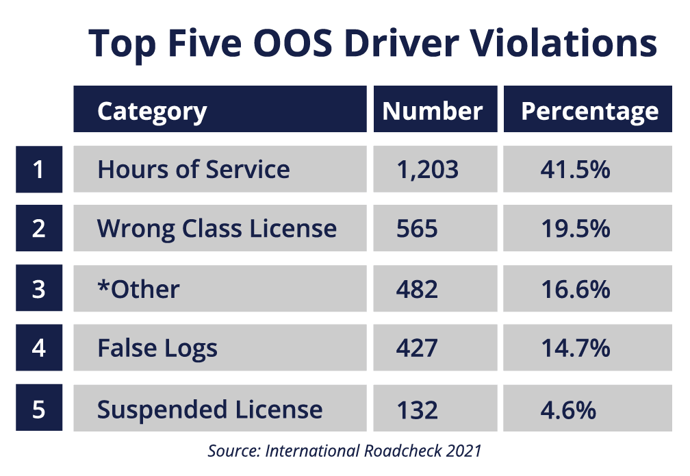 - HOS violations in 2021 made up 41.5% of Out of Service Driver Violations